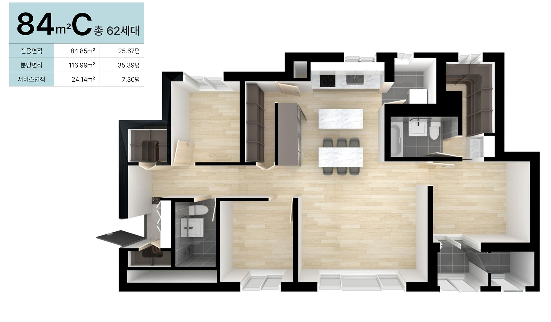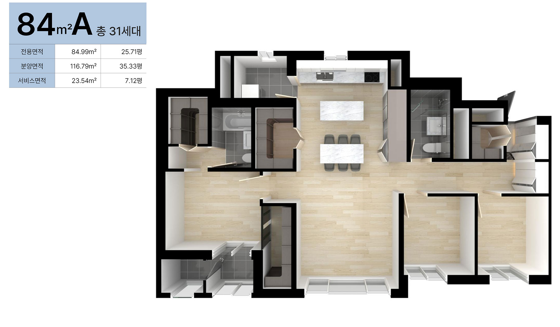 와이드한 거실과 넉넉한 주방 설계로 가족 소통의 즐거움을 더한 혁신 평면